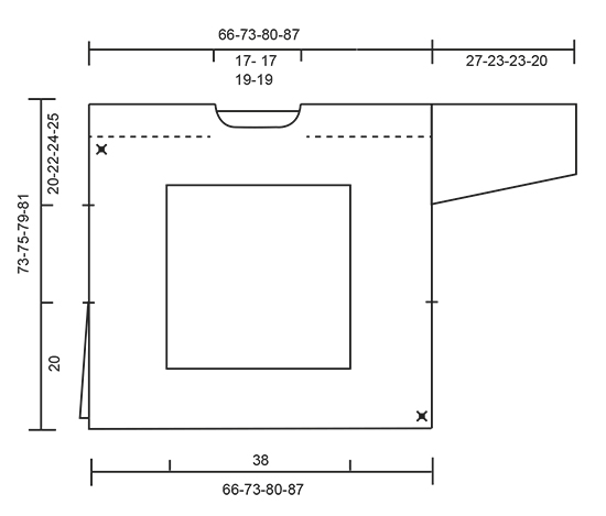 Размер L/XL: вязать прямыми и обратными рядами по направлению к бокам джемпера. Начать с крестика в углу (прежде нить необходимо отрезать) — см. диаграмму, и вязать так: А.4d в угол, А.4b по след. 80 ст.с2н (= 40 повторов) и А.4а в след. угол. Когда А.4 будет выполнен по вертикали, в последнем ряду 85 ст.с2н. Обрезать и закрепить нить. Повторить с другой стороны квадрата — см. крестик на диаграмме.