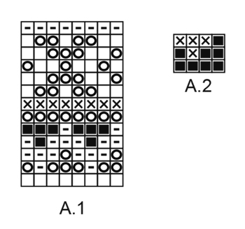 См. диаграммы A.1 и A.2. На диаграммах показаны цвета носков. 1 клеточка в диаграмме = 1 СН.