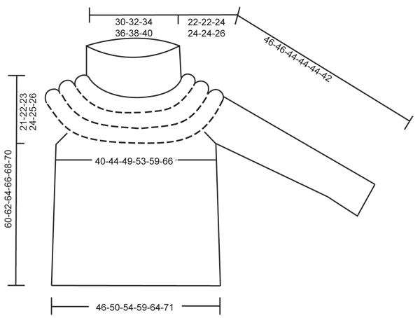 Набрать 16-16-18-18-18-20 п. нитью Polaris. Связать 2 ряда платочной вязкой. Продолжить лицевой гладью, кромочные петли вязать платочной вязкой. На высоте 5 см. прибавить 1 п. с левой стороны детали — см. инструкцию по прибавлению. Прибавить 1 п. с правой стороны через 4-3-3-3-2.5-2.5 см. Попеременно прибавлять слева и справа по 1 п. через каждые 4-3-3-3-2.5-2.5 см. в общей сложности 10-12-12-12-14-14 раз (т.е. по 5-6-6-6-7-7 раз с каждой стороны) = 26-28-30-30-32-34 п. На высоте 46-46-44-44-44-42 см. закрыть по 2 п. в начале следующих двух рядов = 22-24-26-26-28-30 п. Переснять петли на булавку и связать второй рукав тем же образом.